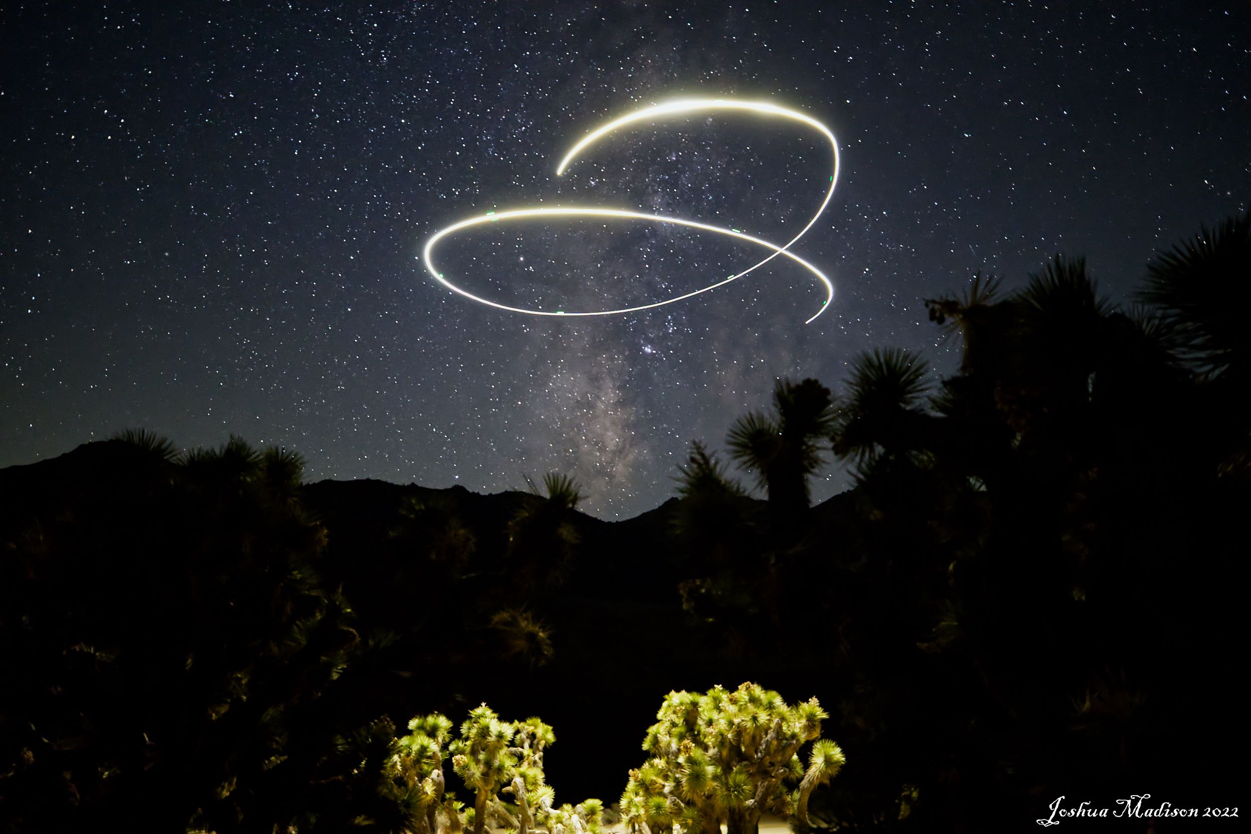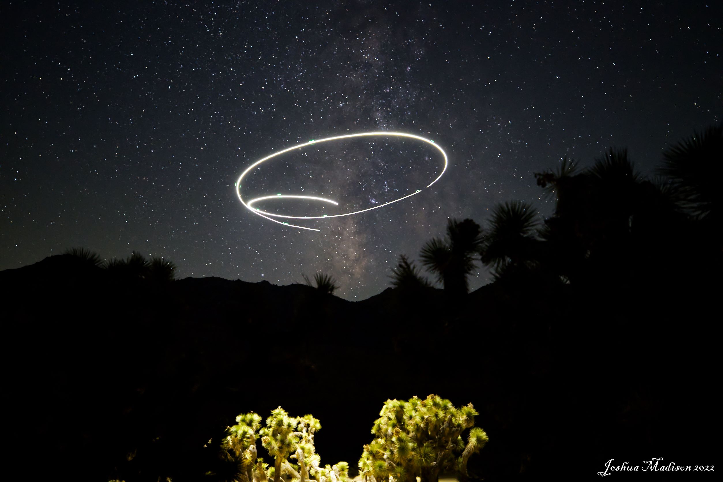 Even though the winds were blowing I finally decided to pull out my drone. This was the 2nd time I’ve attempted light painting with my DJI Mavic Air 2. In the photo below I was able to illuminate the Joshua Trees from 50ft above using the landing light on my drone.