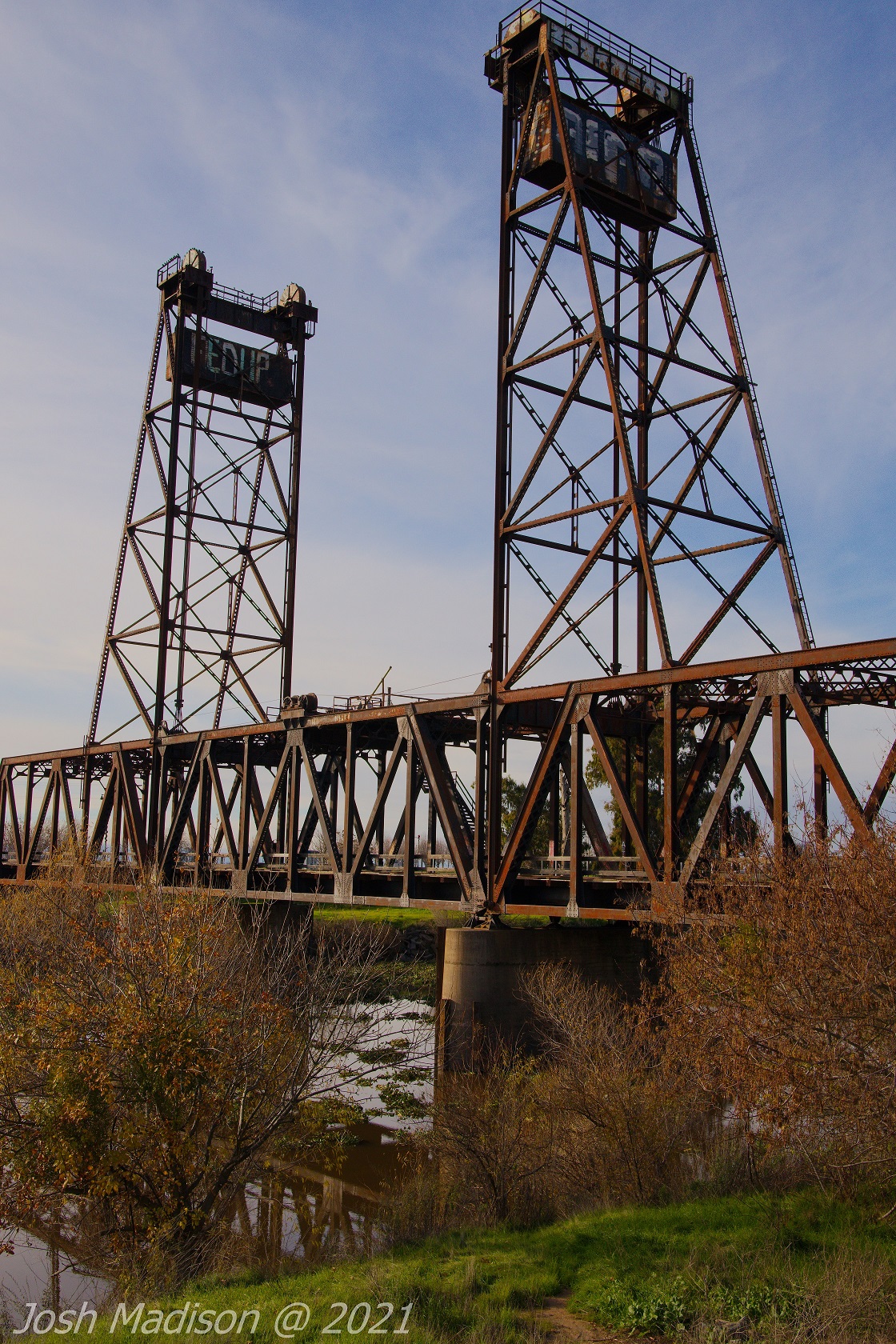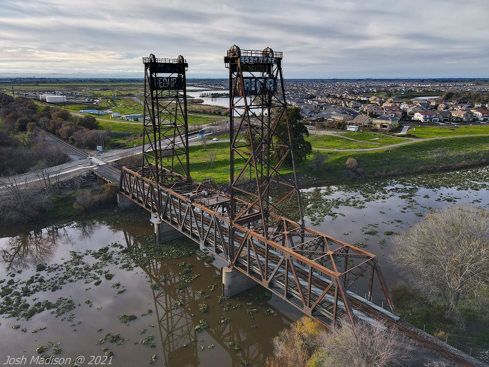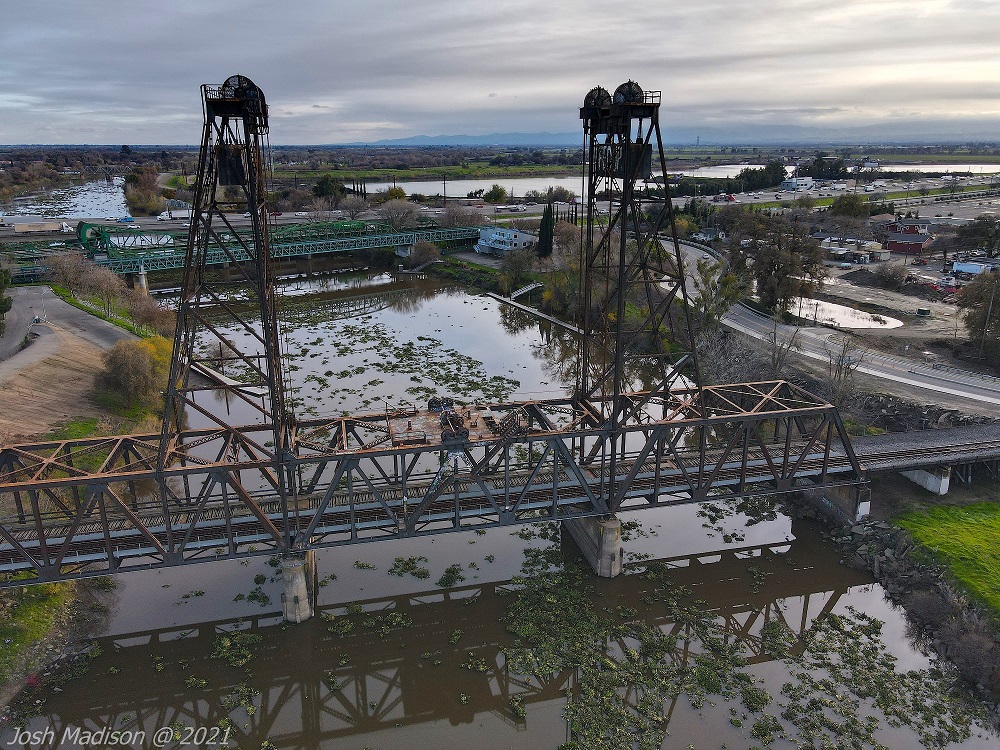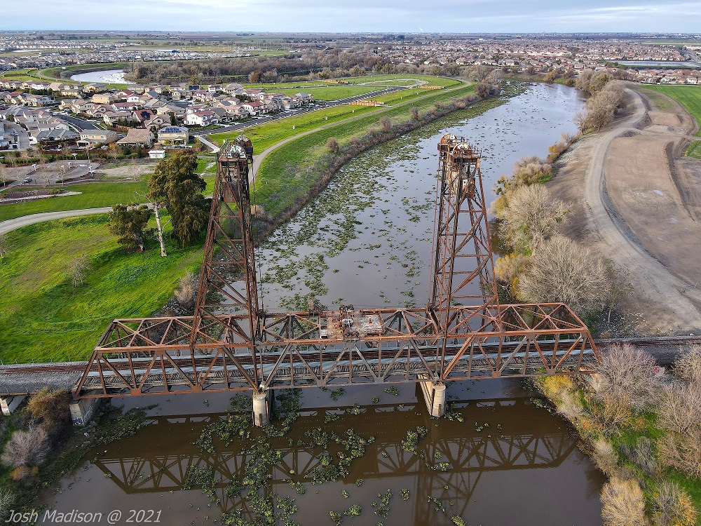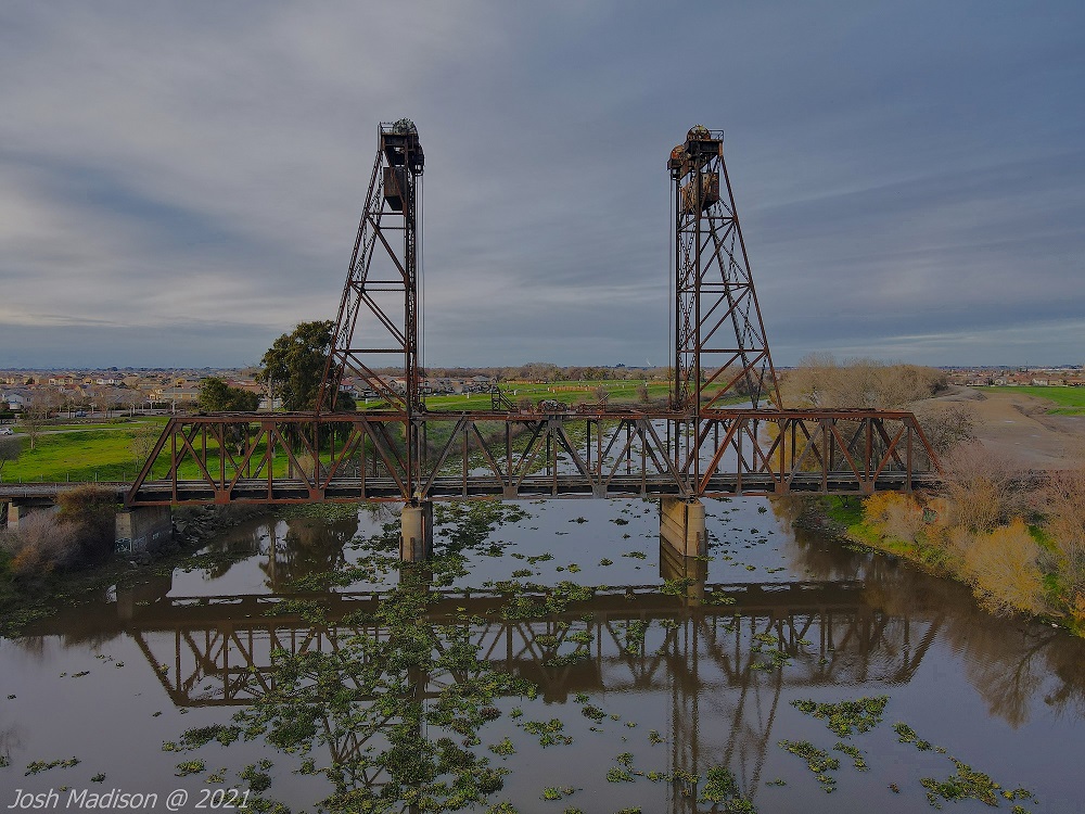 The Mossdale Railroad Bridge is a vertical lift draw bridge over the San Joaquin River near Lathrop, CA. It opened September 8, 1869 establishing itself as the last link in the transcontinental railroad. This was the last link allowing train travel from the Atlantic to the Pacific.